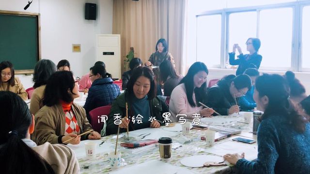 阳春三月, 花红柳绿, 2019年3月29日下午国际教育学院的35名女教师集聚在虹口校区1号楼802, 开展了一场别开生面的团扇绘画。活动伊始,在老师的引领下,大家感受着薄荷精油的香氛,进入了绘画前的静心冥想环节。调息合眼,放松身体,五分钟的冥想让大家抛开杂念,专注当下,心也变得沉静、通透。接着,跟随着绘画指导老师,大家开始在宣纸上构思草图,继而在团扇上作画。有些女老师,对绘画颇有经验,短短十几分钟就大功告成;画到尽兴出,更有老师当场挥毫书写了应景小诗,好不酣畅淋漓。对于大多数女老师来说,这是第一次接触水墨画,对着色和画笔的运用还很陌生,但她们丝毫都不畏困难,在绘画老师的个别指导下,不仅出色地完成了画作,更是个性化地添入了自己或童趣、或雅致的创意装饰。活动结束后,不少老师表示,在这次闻香绘画的艺术活动,让自己从平时的繁琐杂务中抽离出来,获得了放松,也激发了自己画出美好,创造美好的愿景。 (曾莉报道)