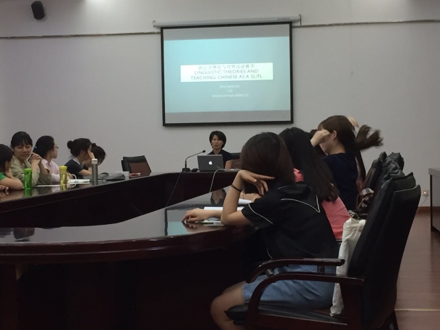 6月14日第一场讲座的主题是“语言学理论和对外汉语教学”(Linguistic Theory and Teaching Chinese as a Second Language)。井茁教授为我们梳理从乔姆斯基的转换生成学派到认知学派等各个语言学流派的知识并将这些语言学相关知识应用到对外汉语教学之中。井教授运用具体的教学实例帮助同学们加深对讲座内容的理解。例如,她提到了“把”字句教学的现状,在实际教学中尚存在很大的问题与不足:在“把”字句的四种用法中,学习者在使用时会避免那些难度较高的用法,选择使用最基本的句式,这对汉语教师来说是一个值得研究和思考的问题。在随后的提问环节,同学们踊跃提问,和井茁教授进行互动讨论。例如就“中英文教学的差别”这一话题,井茁教授提出,汉语和英语最大的区别在于汉语是一种“声调语言”,并强调了对外汉语教学中“声调教学”及“汉字教学”的重要性。