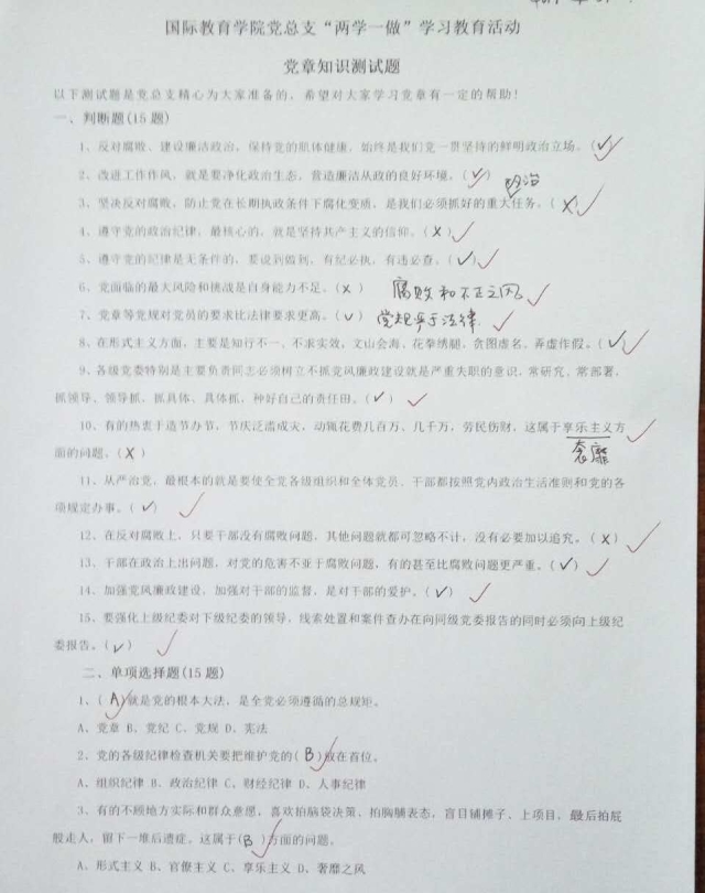 为了深入推进“两学一做”学习教育,引导党员进一步坚定理想信念、增强“四个意识”、强化宗旨观念,10月21日,国际教育学院党总支在前期集体学习和个人自学的基础上,组织教工党支部全体党员开展“两学一做”理论知识测试。