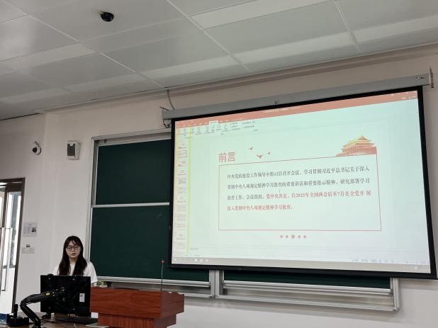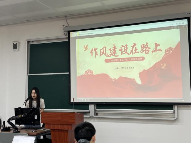在分组领学环节,各小组围绕不同维度展开研讨。第一小组系统梳理了中央八项规定的提出背景、内涵及具体内容,结合违规事例敲响“警示钟”;第二小组聚焦概念辨析,讲述了中央八项规定和中央八项规定精神的内涵与不同;第三小组以“作风建设在路上”为切入点,从中央八项规定简介、主要内容到作风转变与政治建设的关联,分析“四风”问题的现实挑战,并结合青年身份进行探讨;第四小组阐述了中央八项规定精神的历史意义,并从学生党员角度讨论如何贯彻落实中央八项规定精神。