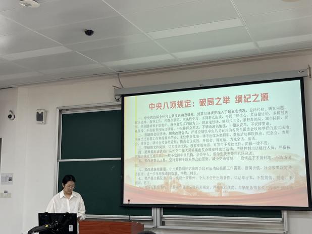 首先,张老师传达了深入贯彻中央八项规定精神学习教育相关通知要求,并围绕历史脉络、现实挑战和实践要求等三个维度带头交流心得体会。